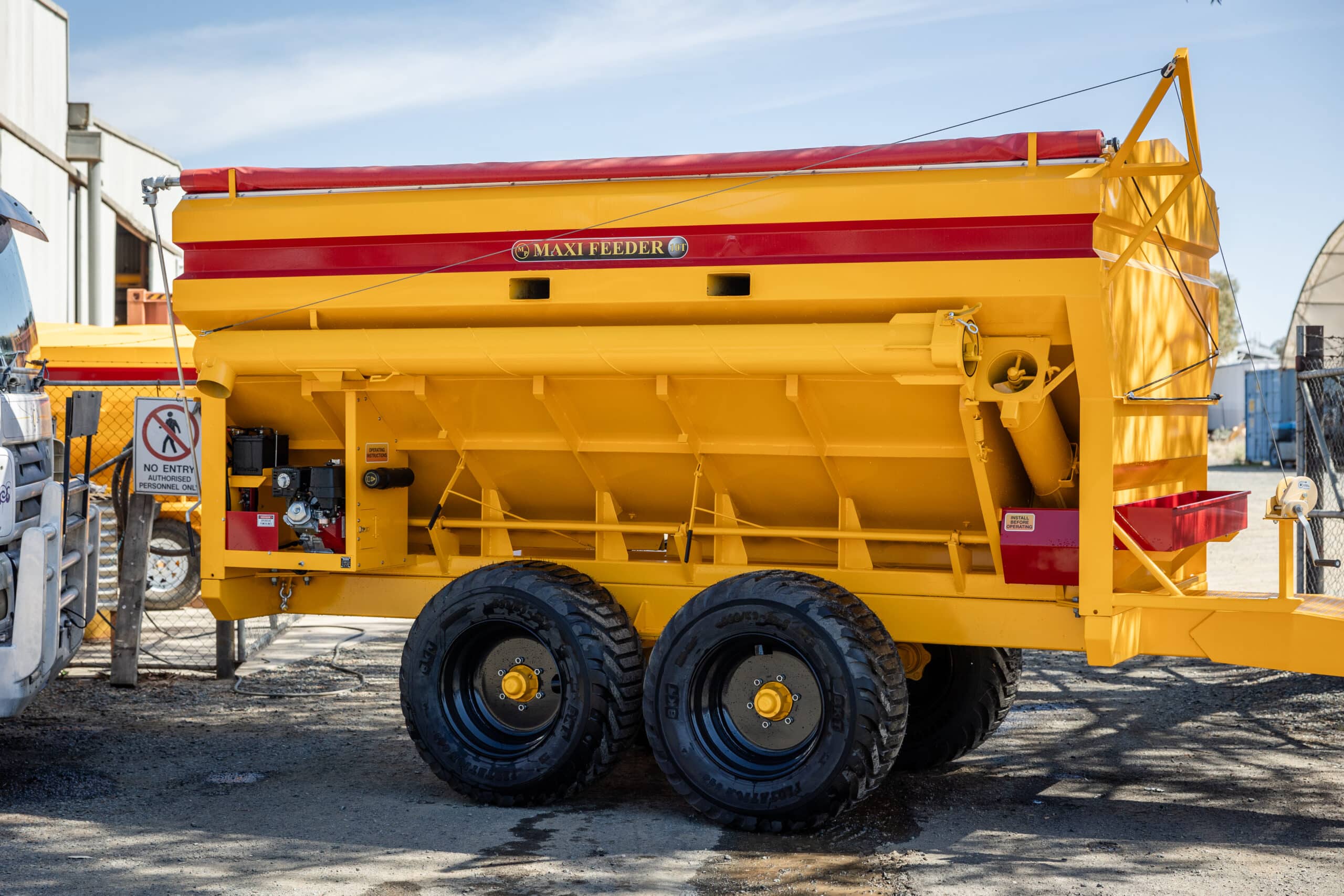 The “Maxi Feeder Bulk Bin” is our latest design after popular demand for a larger multi-purpose capacity holding bin. This machine offer’s a great alternative to our 70Bag Ezy Feeder. The Maxi Feeder features a 10 Tonne bin capacity on an all-terrain walker, great for great for bulk feeding and fertilizing, feed lotting and working across undulating country.